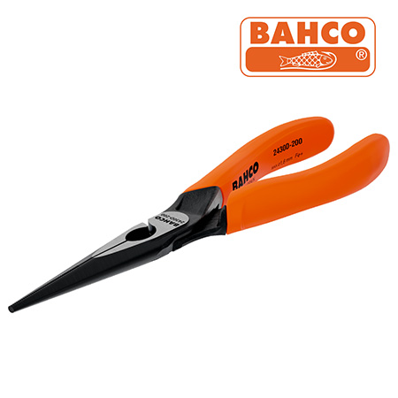 Alicate de ponta longa com cabos monomaterial e acabamento fosfato (200 mm) 2430 D-200. Alicate de bico longo reto (snipe nose). Material: Aço de liga de alto desempenho. Acabamento: Fosfatado preto com tratamento anticorrosivo. Revestimento: PVC monocomponente. Design: Ergonômico, para maior conforto e controle. Capacidade de Corte. Fio de cobre: até 3,0 mm. Ferro: até 1,8 mm. Liga de ferro: até 1,6 mm. Arestas de corte: endurecidas, ideais para fios macios e duros . Fabricante: Bahco - PN: 2430 D-200