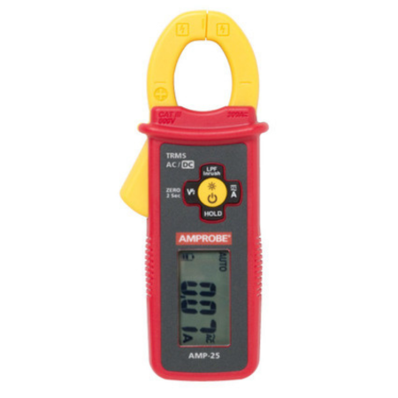 Alicate amperimetro AC/DC AMP-25, apresenta detecção True-RMS para medições precisas de tensão em ambientes elétricos ruidosos